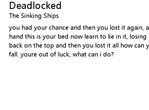 | you had your chance and then you lost it again, asked for help you wont lend a hand this is your bed now learn to lie in it, losing respect and you wont get it back on the top and then you lost it all how can you expect me to break your fall. youre out of luck, what can i do? |