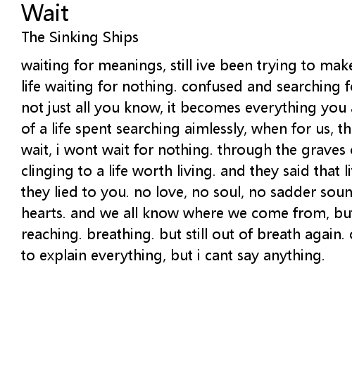 waiting for meanings, still ive been trying to make some sense. al this wasting life waiting for nothing. confused and searching for so long that sometimes its not just all you know, it becomes everything you are. trying to make some sense of a life spent searching aimlessly, when for us, this is everything. i wont wait, i wont wait for nothing. through the graves of what weve been through clinging to a life worth living. and they said that life is what you choose and they lied to you. no love, no soul, no sadder sound than the crushing of our hearts. and we all know where we come from, but were never going home. trying. reaching. breathing. but still out of breath again. out of words again, trying to explain everything, but i cant say anything.