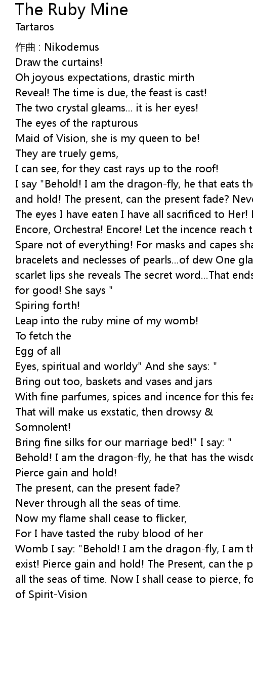 | I say "Behold! I am the dragon-fly, he that eats the eyes of sages! Pierce gain and hold! The present, can the present fade? Never! Through all the seas of time The eyes I have eaten I have all sacrificed to Her! Now my prayers are heard... Encore, Orchestra! Encore! Let the incence reach the roof of this cathedral Spare not of everything! For masks and capes shall fall now! She wears only bracelets and neclesses of pearls...of dew One glance, one touch... with her scarlet lips she reveals The secret word...That ends the flickering of the flame for good! She says " | |