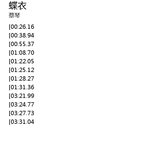 | [02:13.05][00:26.16] | 被你轻轻揭去 我那美丽的蝶衣 |
