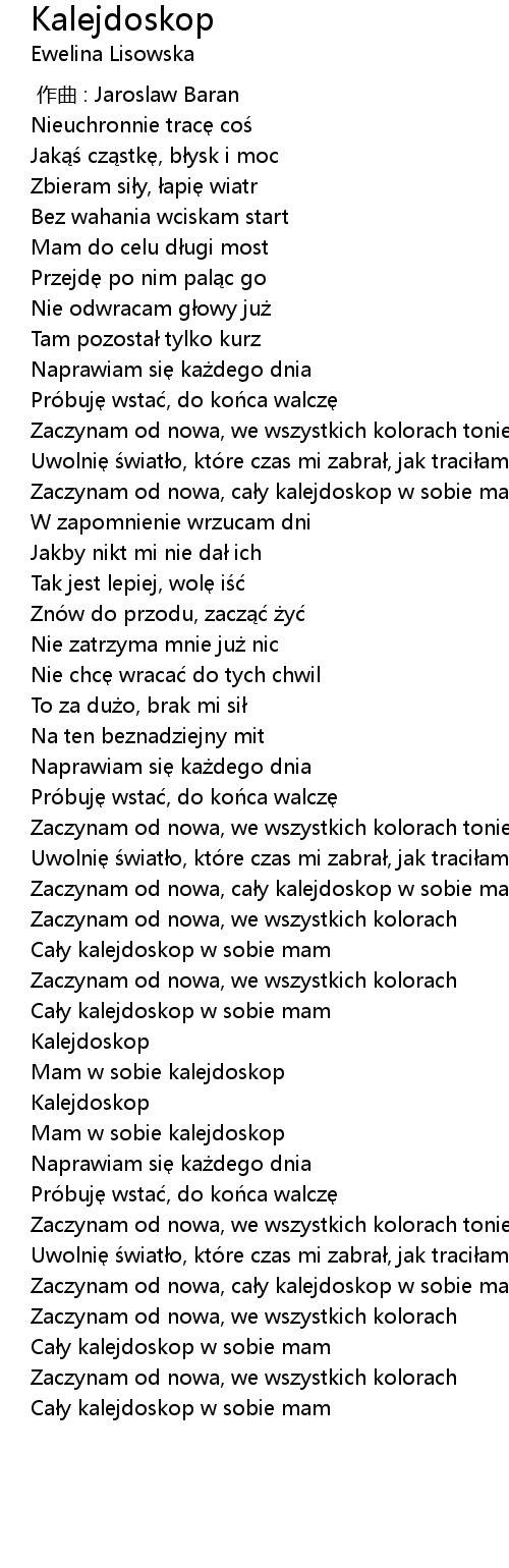 | [02:40.87] | Zaczynam od nowa, ca y kalejdoskop w sobie mam |