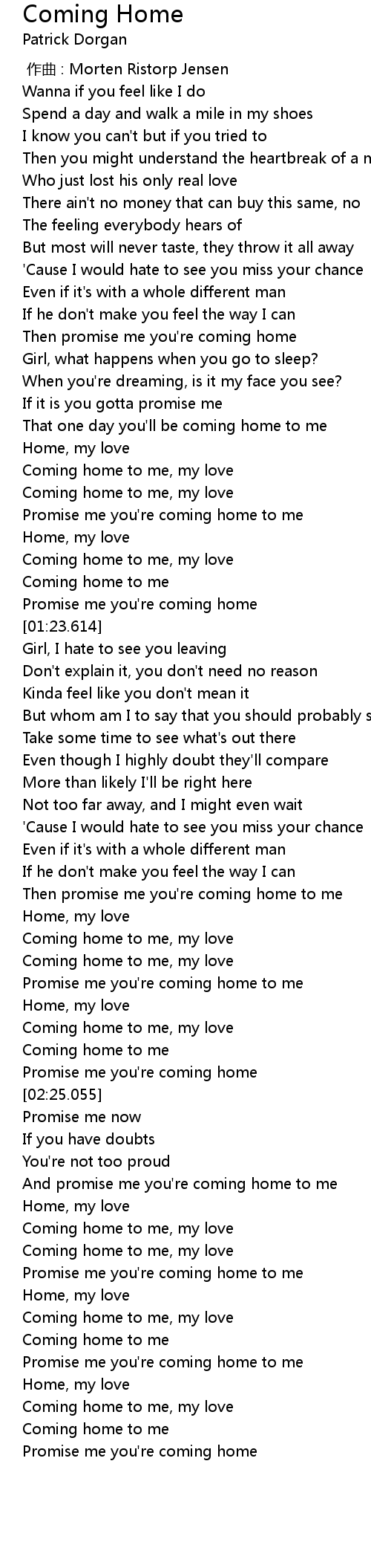 | [00:45.380] | Then promise me you' re coming home |