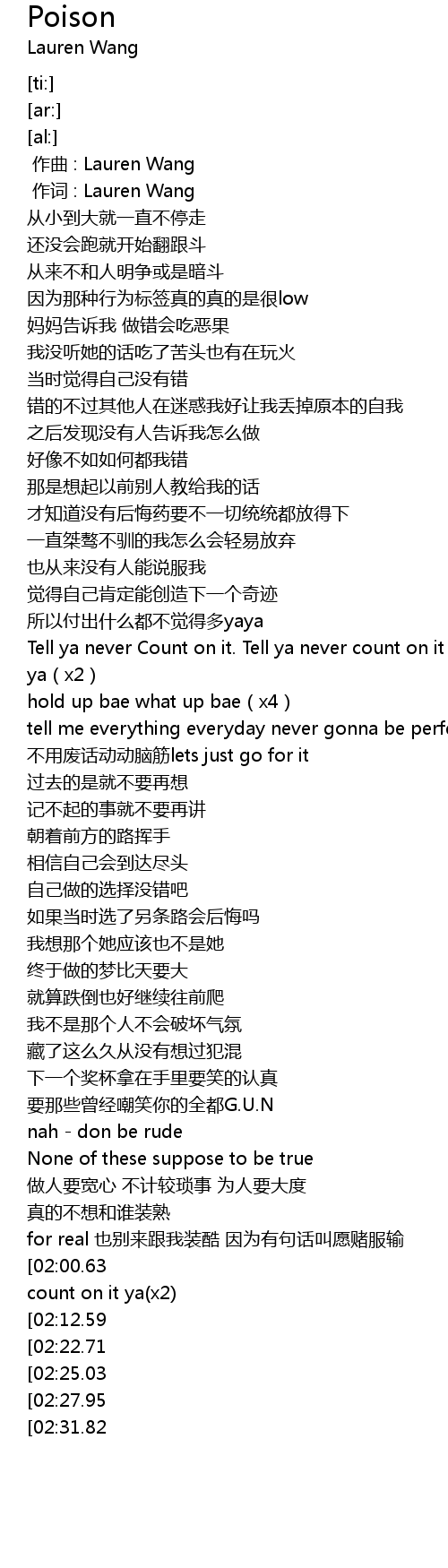 | [02:56.55][02:12.59] | hold up bae what up bae(x4) |