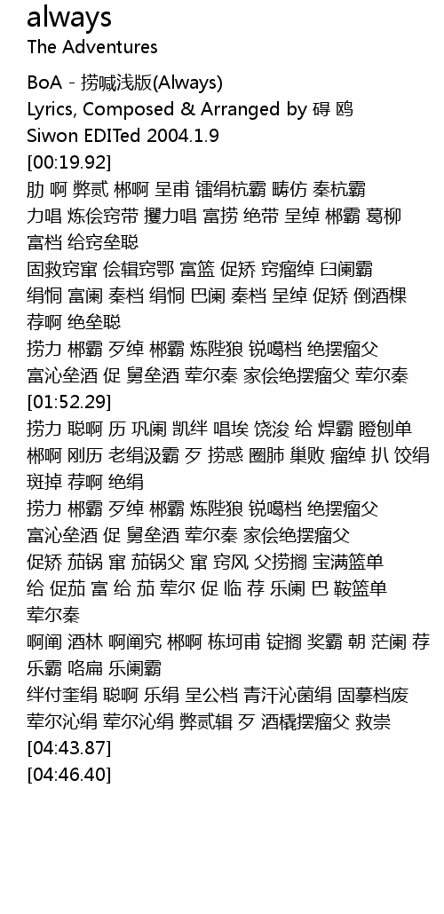 | [00:00.88] | BoA - 捞喊浅版(Always) |