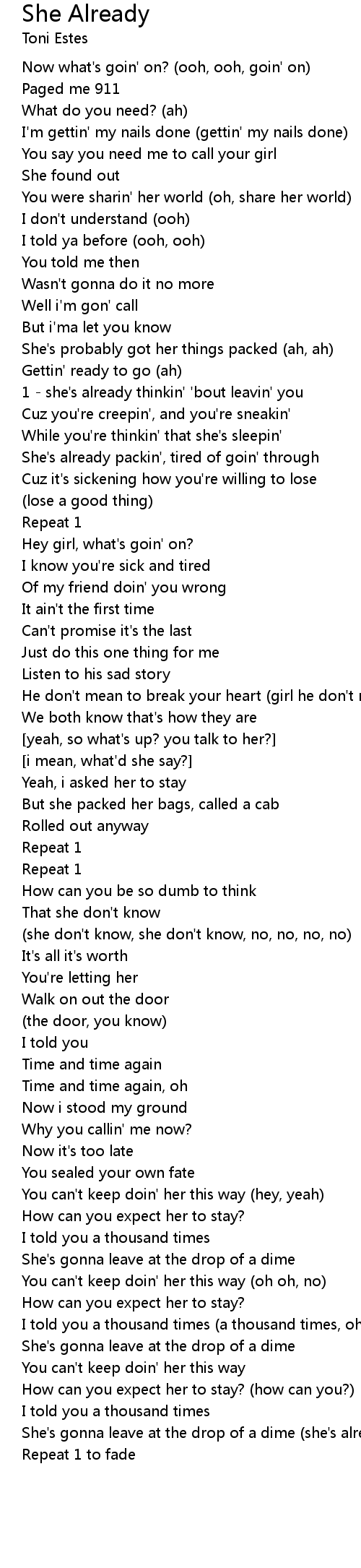 1 - she's already thinkin' 'bout leavin' you |