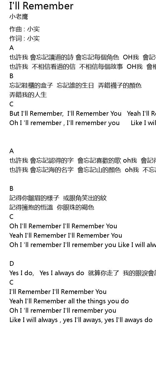 | yě xǔ wǒ huì wàng jì rèn dé de zì huì wàng jì xǐ huān de gē oh wǒ huì jì dé nǐ | |