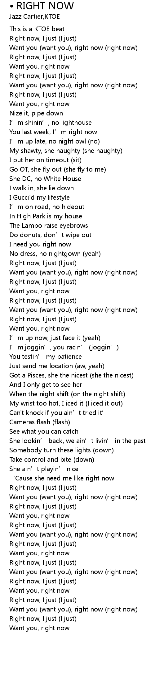 | [00:18.04] | Want you (want you), right now (right now) |
