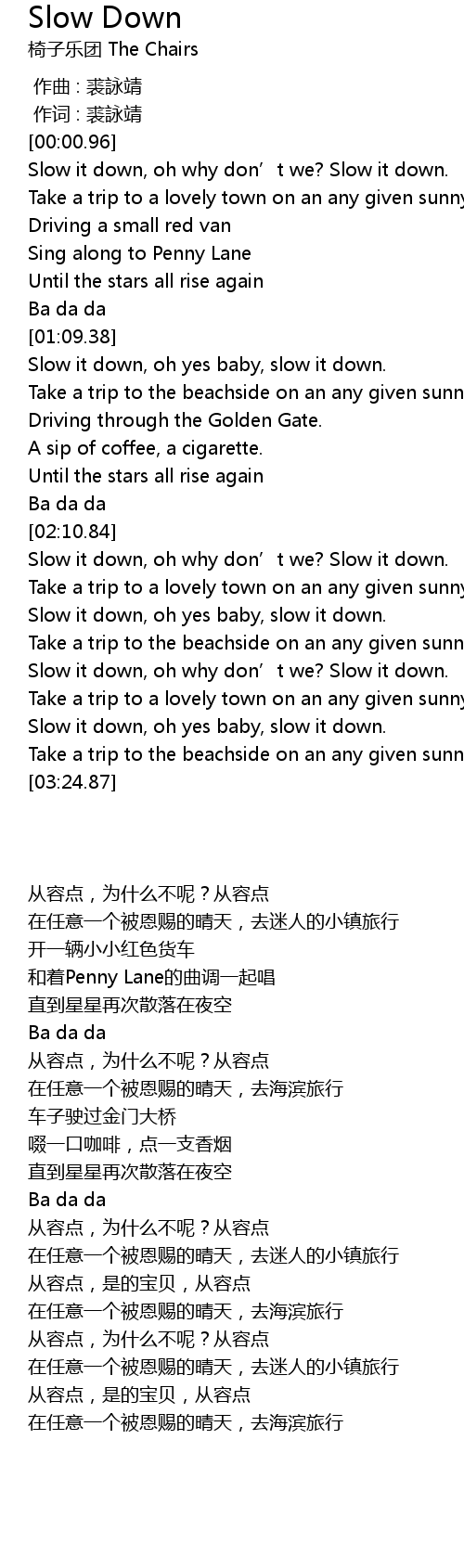 | [00:10.38] | Slow it down, oh why don’t we? Slow it down. |