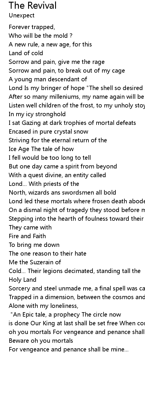 | Behold my angry song [Servant Spirit:] "An Epic tale, a prophecy The circle now is done Our King at last shall be set free When converge moon and stars Beware oh you mortals For vengeance and penance shall be ours..." | |