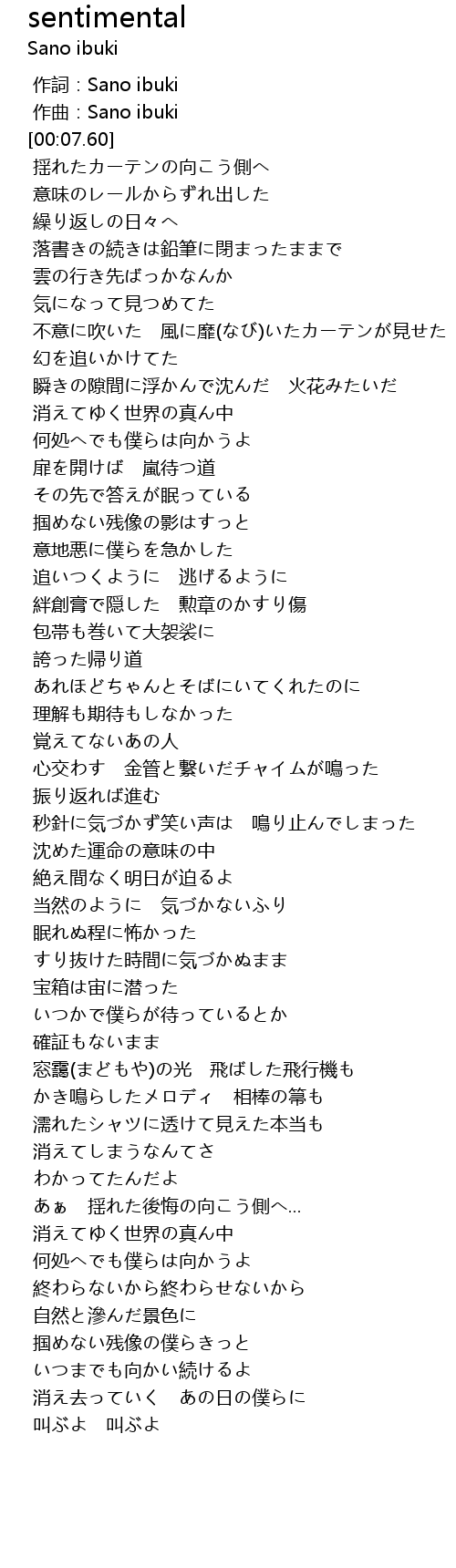 | [00:02.55] | 作詞:Sano ibuki |