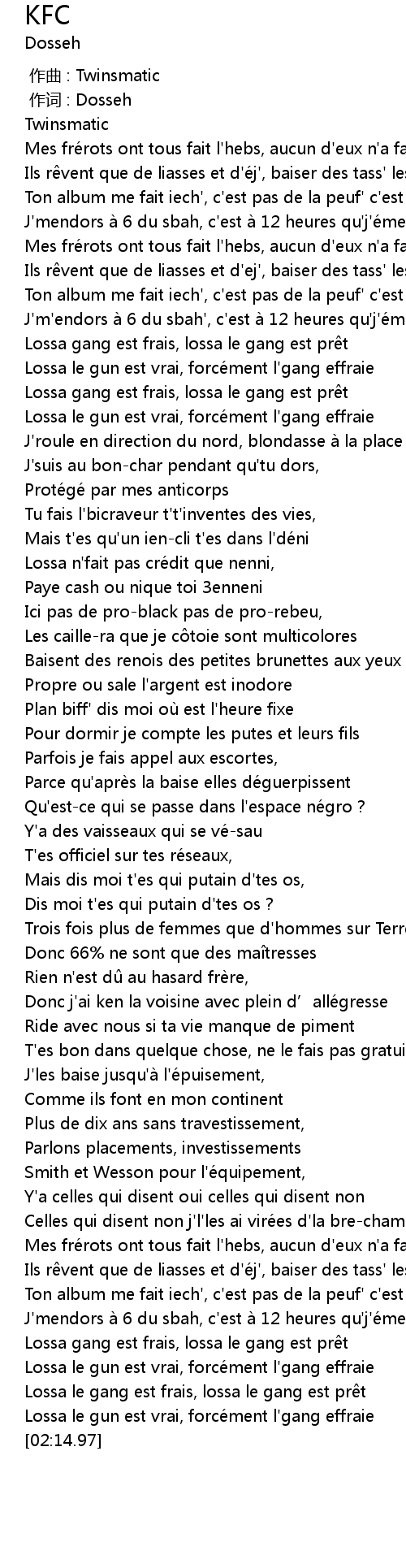 | [00:42.97] | Lossa gang est frais, lossa le gang est pr t |