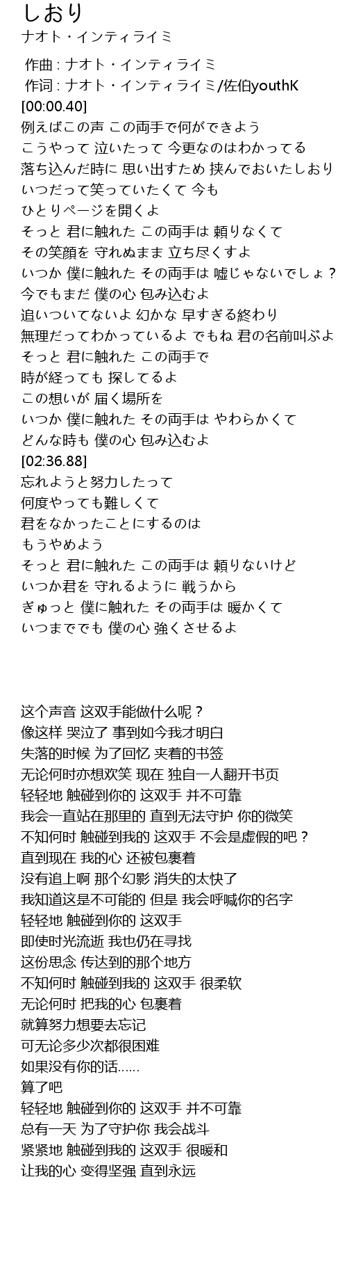 | [00:21.64] | 落ち込んだ時に 思い出すため 挟んでおいたしおり |