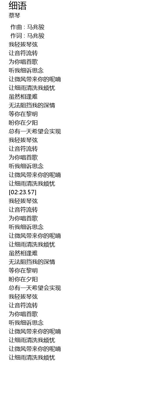 | [01:23.15] | ràng xì yǔ qīng xǐ wǒ fán yōu |