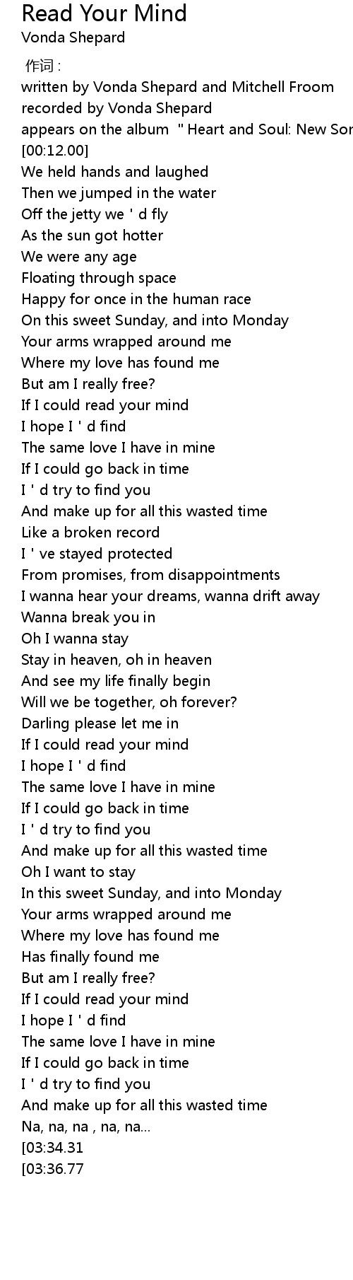 | [03:41.45][03:34.31][03:24.92] | If I could read your mind |