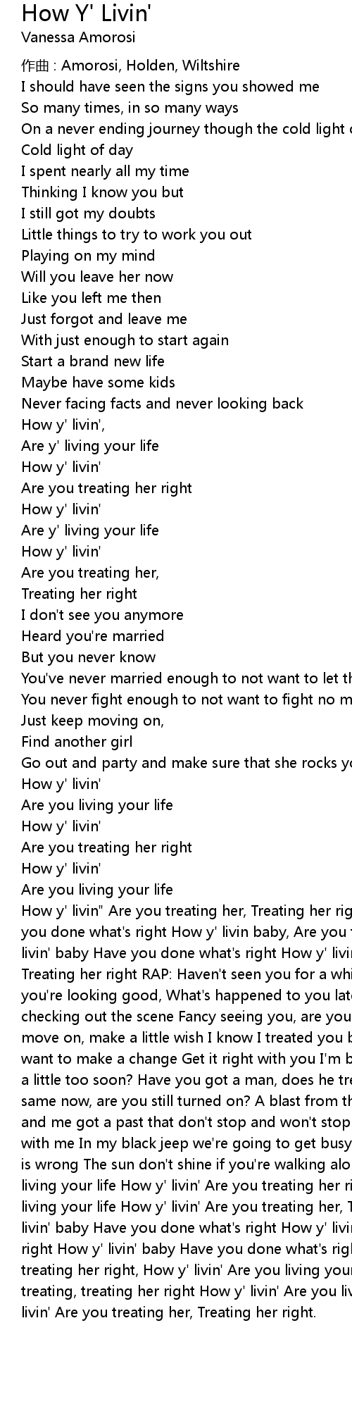 | How y' livin" Are you treating her, Treating her right How y' livin baby, Have you done what' s right How y' livin baby, Are you treating her right How y' livin' baby Have you done what' s right How y' livin' baby, Are you treating her, Treating her right RAP: Haven' t seen you for a while Can I come over baby Damm you' re looking good, What' s happened to you lately I' ve been cruising round, checking out the scene Fancy seeing you, are you still feeling angry Time to move on, make a little wish I know I treated you bad But I' ve grown up since I want to make a change Get it right with you I' m begging on my knees Have I moved a little too soon? Have you got a man, does he treat you good Do you feel the same now, are you still turned on? A blast from the past, take a load off You and me got a past that don' t stop and won' t stop Pack your bags up, take a ride with me In my black jeep we' re going to get busy I' m living right, without you is wrong The sun don' t shine if you' re walking alone. How y' livin' Are you living your life How y' livin' Are you treating her right How y' livin' Are you living your life How y' livin' Are you treating her, Treating her right How y' livin' baby Have you done what' s right How y' livin baby Are you treating her right How y' livin' baby Have you done what' s right How y' livin baby, Are you treating her right, How y' livin' Are you living your life How y' livin' Are you treating, treating her right How y' livin' Are you living your life How y' livin' Are you treating her, Treating her right. |