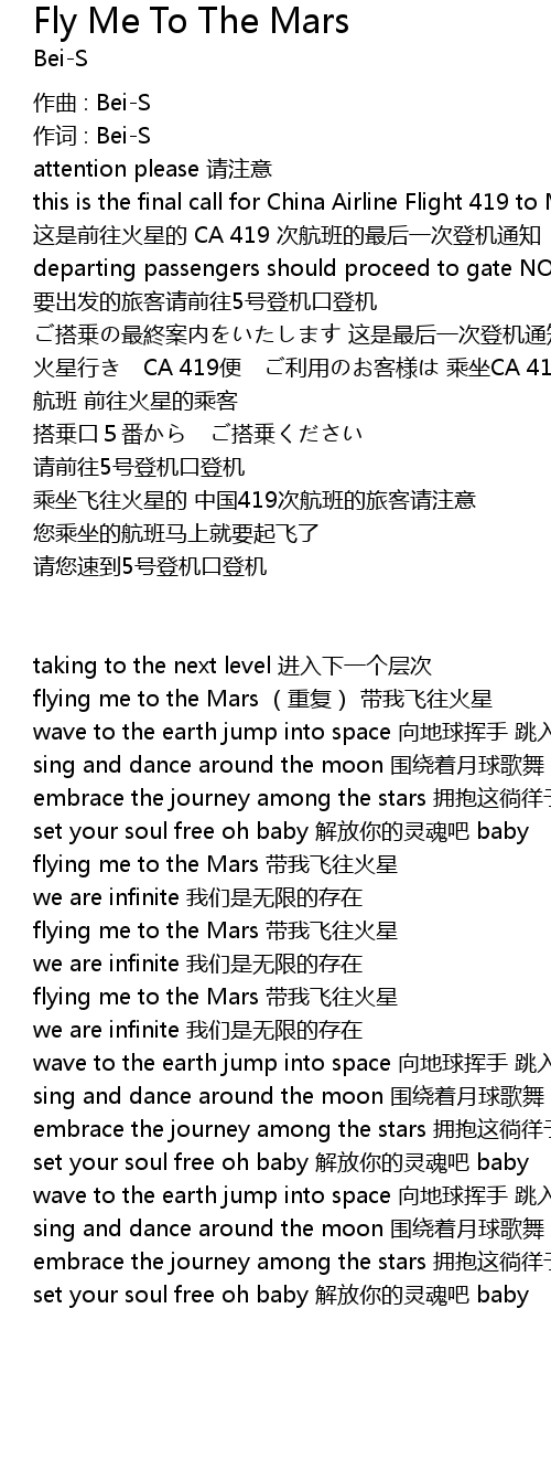 | [01:08] | flying me to the Mars chóng fù dài wǒ fēi wǎng huǒ xīng |