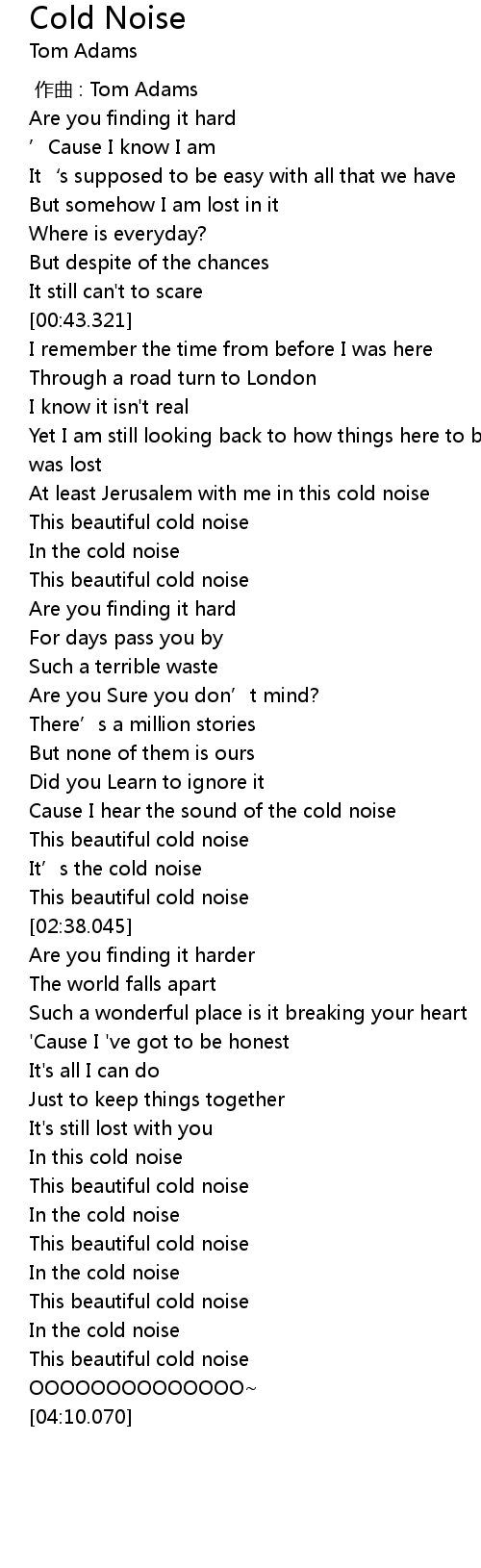 | [02:05.655] | Cause I hear the sound of the cold noise |