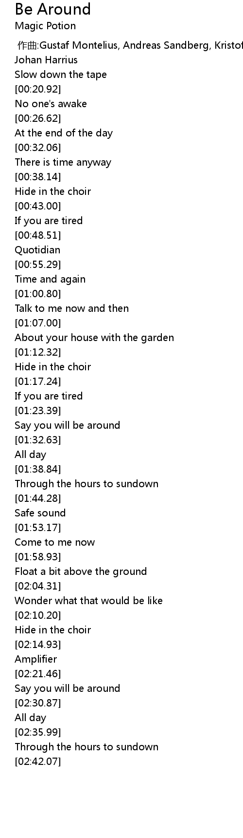 | [00:01.000] | zuo qu: Gustaf Montelius, Andreas Sandberg, Kristoffer Bystr m, Johan Harrius |