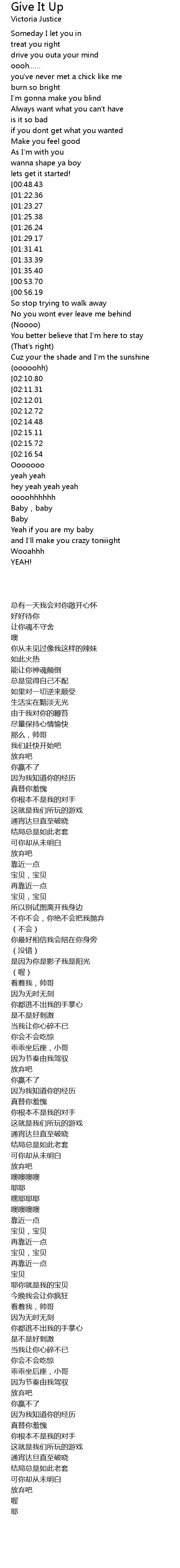 | [00:32.53][00:48.43][01:21.48][01:37.42][02:18.40][02:34.45] | Give it up |
