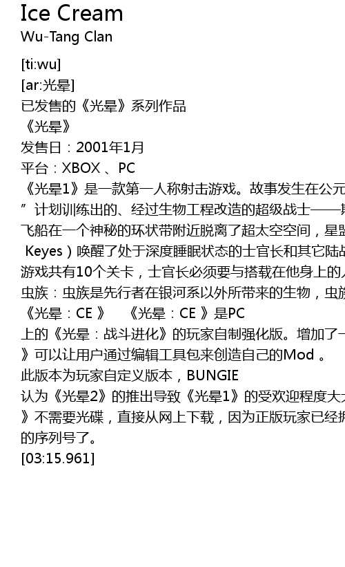 | [01:47.642] | 游戏共有10个关卡,士官长必须要与搭载在他身上的人工智能系统科塔娜一起并肩作战,打败星盟和一种神秘生物——虫族(Flood)(国内译为:洪魔),并最终发现光晕上的真相。 |