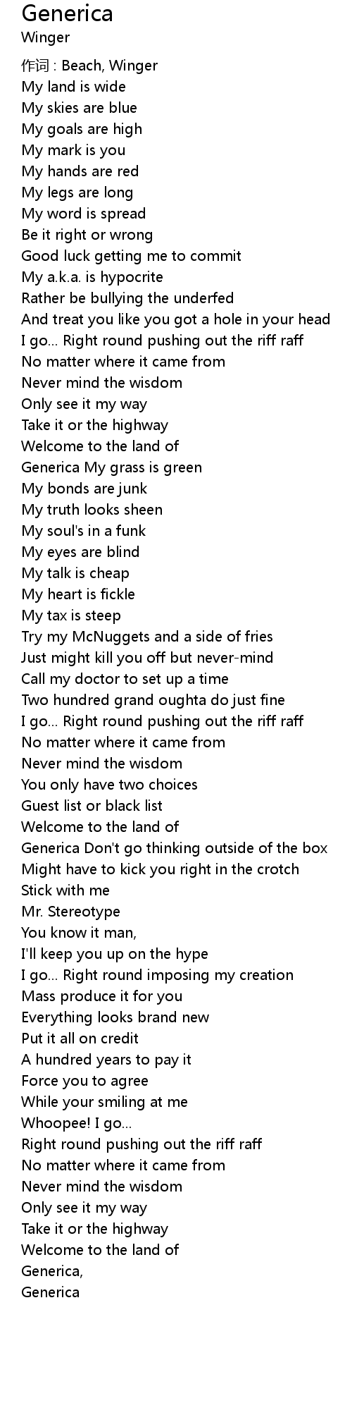 | 作词 : Beach, Winger | |
