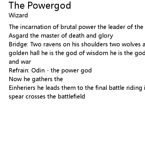 | Bridge: Two ravens on his shoulders two wolves at his feet he is the lord of the golden hall he is the god of wisdom he is the god of rage he is the god of unity and war | |