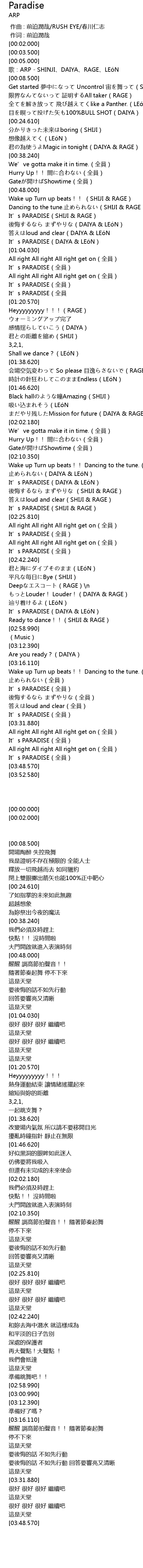 | [00:06.500] | 歌:ARP - SHINJI、DAIYA、RAGE、LEóN |