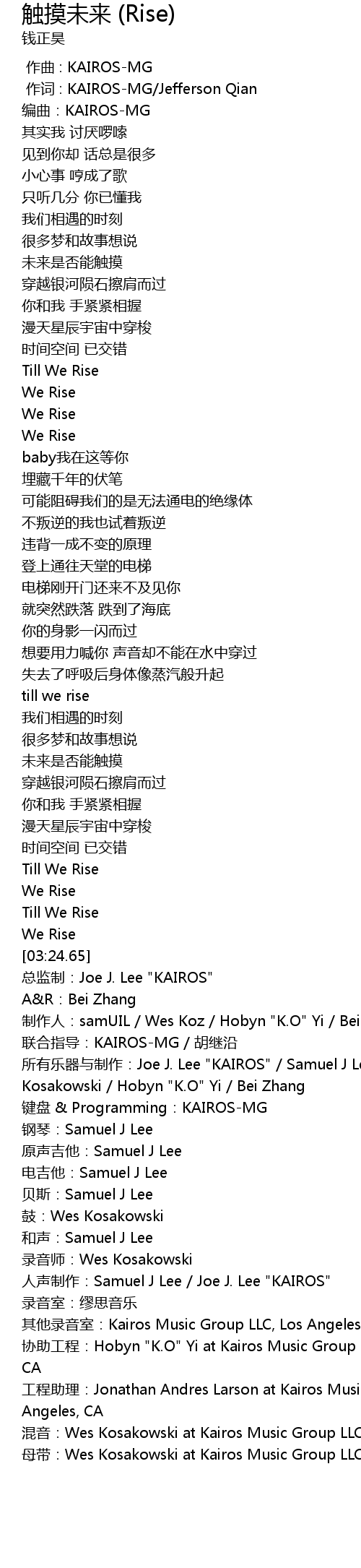 | [03:28.55] | suo you yue qi yu zhi zuo: Joe J. Lee " KAIROS" Samuel J Lee Wes Kosakowski Hobyn " K. O" Yi Bei Zhang |