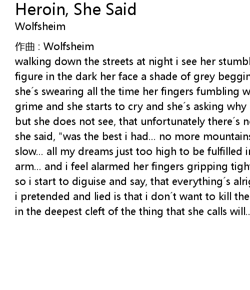 | walking down the streets at night i see her stumbling through the rain a skinny figure in the dark her face a shade of grey begging here and barking there she s swearing all the time her fingers fumbling with her hair a dirty mess of grime and she starts to cry and she s asking why her life s always the same but she does not see, that unfortunately there s no one here to blame " heroin" she said, " was the best i had... no more mountains left to climb. the world so slow... all my dreams just too high to be fulfilled in time...!" she grabs my arm... and i feel alarmed her fingers gripping tight i see her pleading eyes... so i start to diguise and say, that everything s alright... and the reason why i pretended and lied is that i don t want to kill the poor dream that s left in the deepest cleft of the thing that she calls will...! " heroin" she said... |