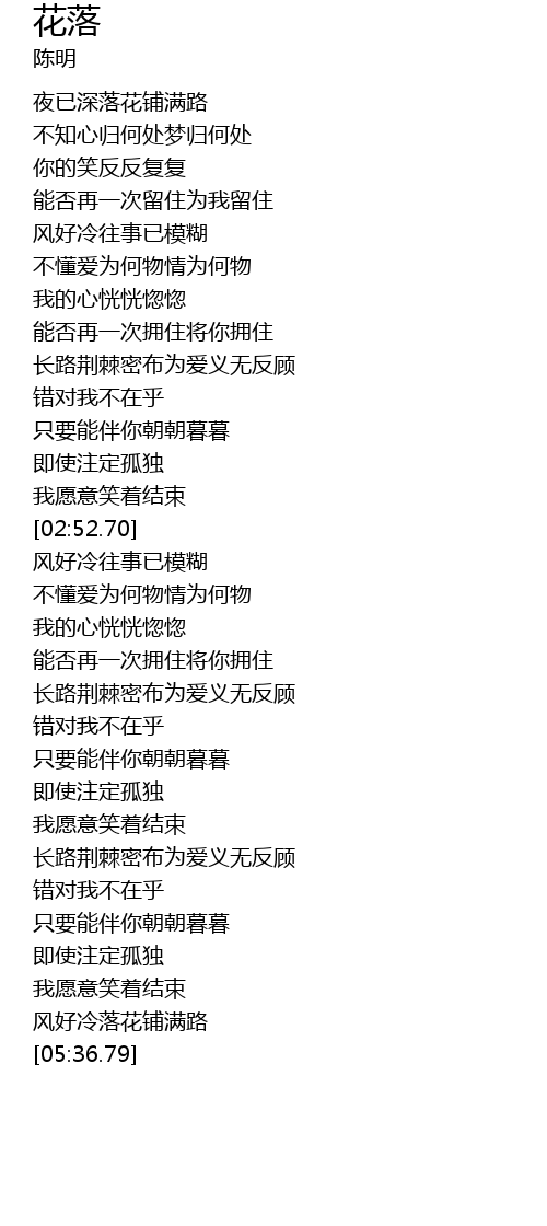 | [00:40.97] | yè yǐ shēn luò huā pù mǎn lù |