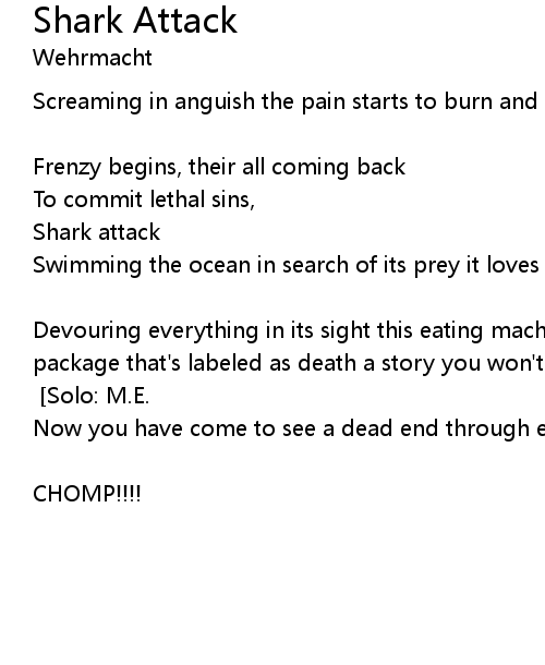 Swimming the ocean in search of its prey it loves to eat you alive, showing no fear its eyes can see on you only you it will thrive [Repeat Chorus] |
