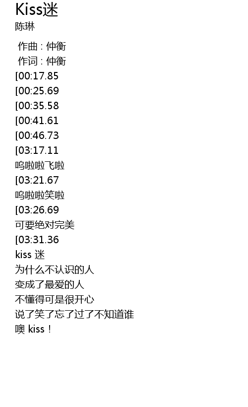 | [03:51.63][03:31.36][02:10.18][01:50.69][01:10.55] | I want kiss 迷 Now I’m a kiss 迷 |