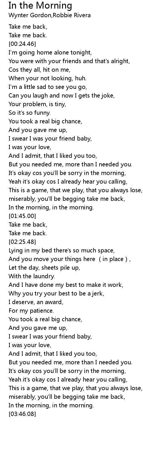 | [01:14.87] | It' s okay cos you' ll be sorry in the morning, |