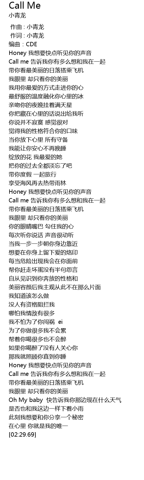 | [00:23.32] | Call me gào sù wǒ nǐ yǒu duō me xiǎng hé wǒ zài yì qǐ |
