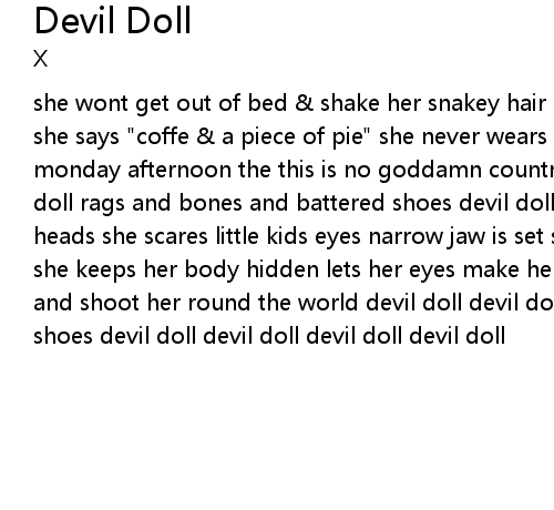 she wont get out of bed & shake her snakey hair grabe her throw her in the tub she says "coffe & a piece of pie" she never wears a dress on sunday or any monday afternoon the this is no goddamn country to wander alone devil doll devil doll rags and bones and battered shoes devil doll devil doll people turn their heads she scares little kids eyes narrow jaw is set shell fix you with a stare she keeps her body hidden lets her eyes make her bid id wrap her up in a bullet and shoot her round the world devil doll devil doll rags ans bones and battered shoes devil doll devil doll devil doll devil doll |