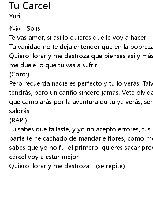 | Pero recuerda nadie es perfecto y tu lo vera s, Talvez mil cosas mejores tendra s, pero un cari o sincero jama s, Vete olvidando de esto que hoy dejas y que cambiara s por la aventura qu tu ya vera s, sera tu ca rcel y nunca saldra s | |