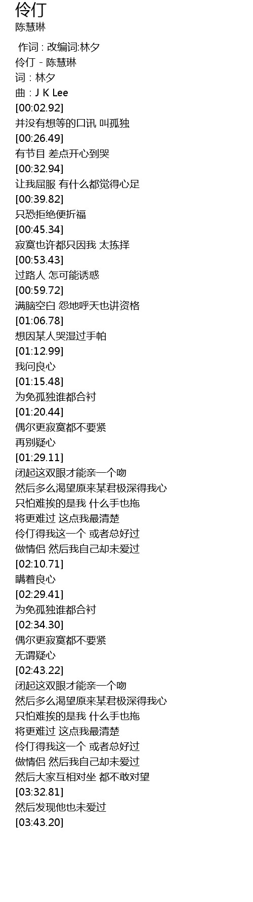 | [00:00.16] | 伶仃 - 陈慧琳 |