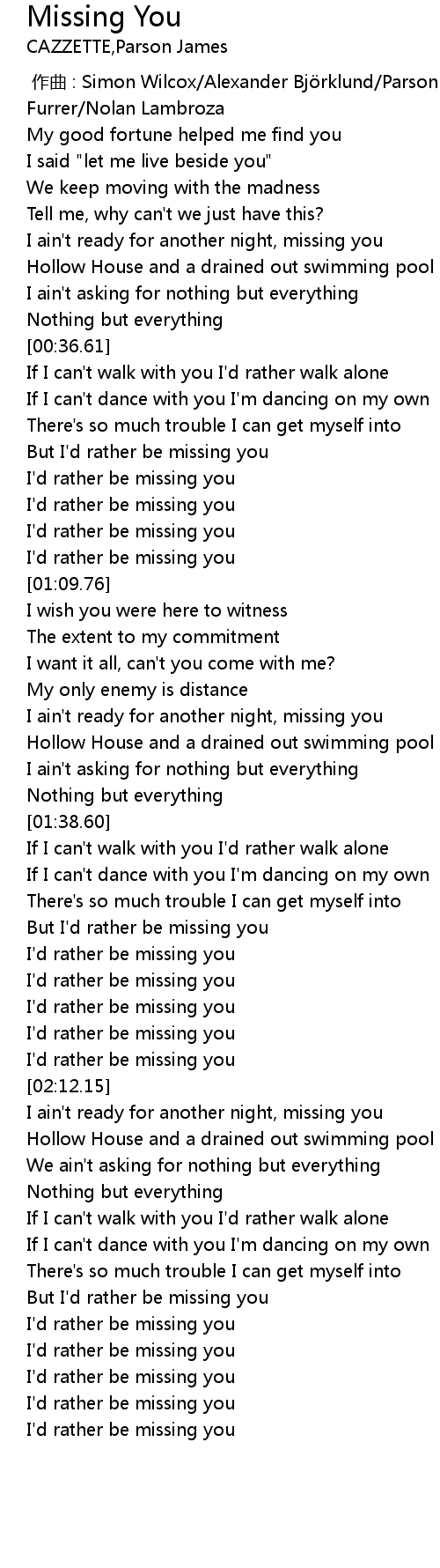 | [02:12.41] | I ain' t ready for another night, missing you |