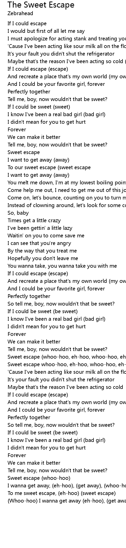 Sweet escape whoo-hoo, eh-hoo, whoo-hoo, eh-hoo) |
