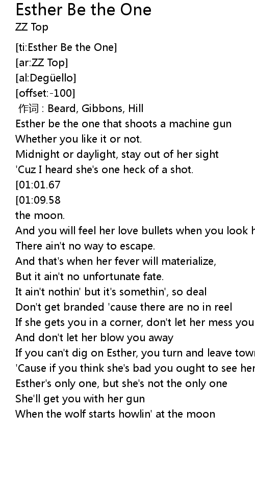 | [00:29.52][01:01.67] | Esther be the one, she' s the only one. |