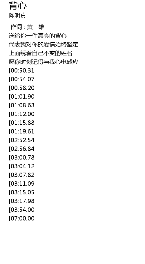 | [03:37.69][03:07.82][01:38.93] | 背心喔背心 |