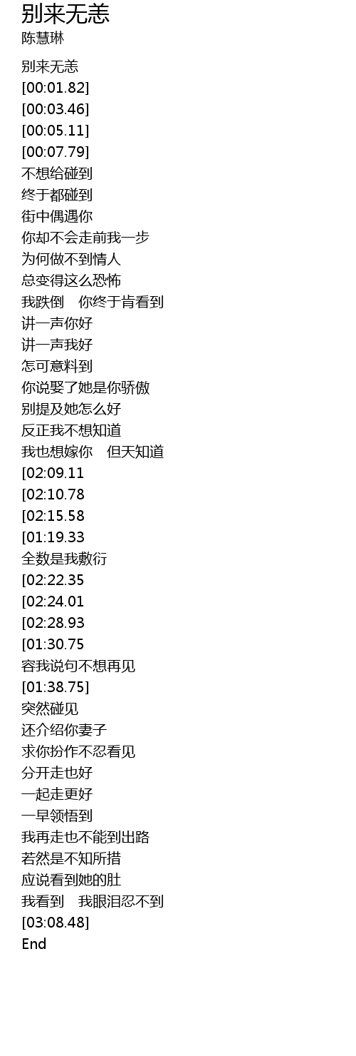 | [02:37.32][02:10.78][01:10.56] | 曾于分手讲过别后愿无恙 |