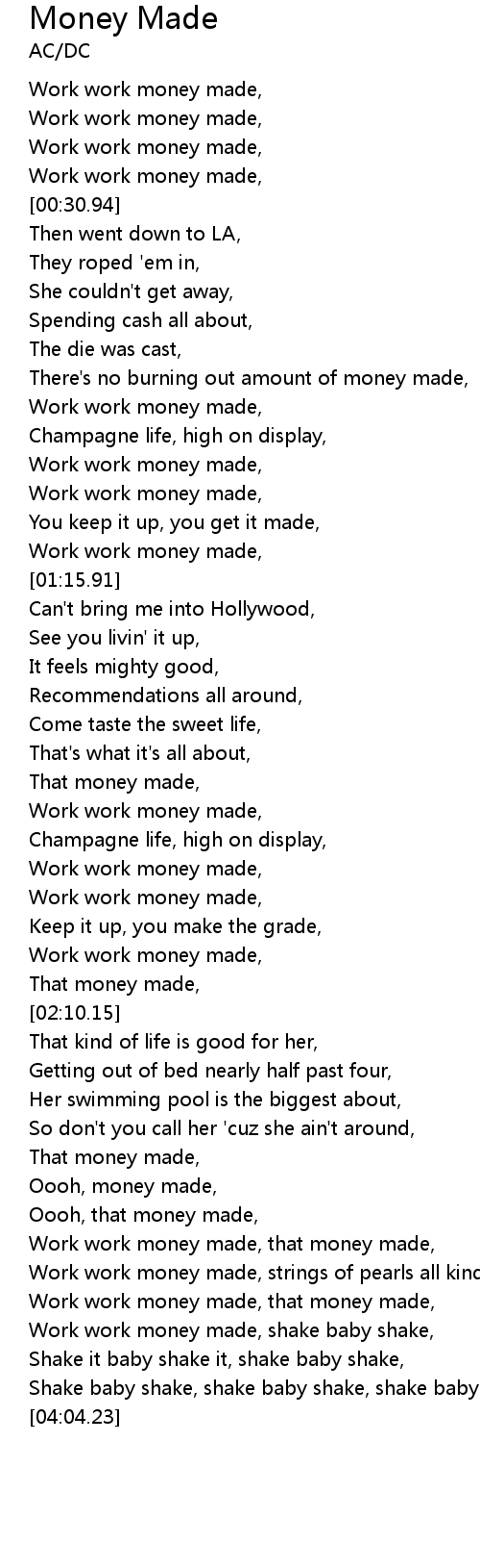 | [03:33.99] | Work work money made, strings of pearls all kinds of change, |