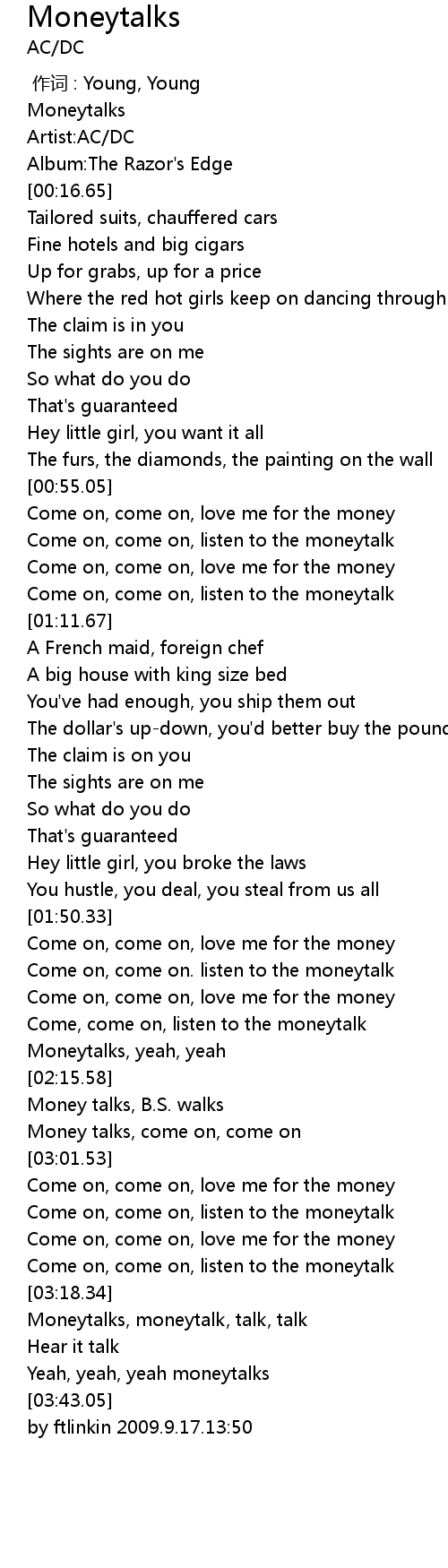 | [03:20.79] | Moneytalks, moneytalk, talk, talk |
