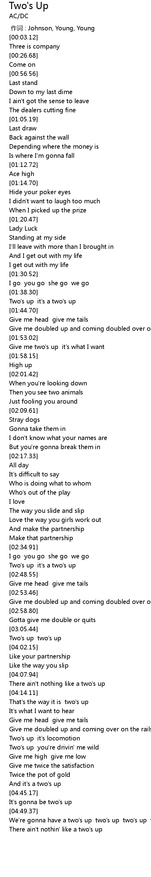| [04:10.71] | There ain' t nothing like a two' s up |