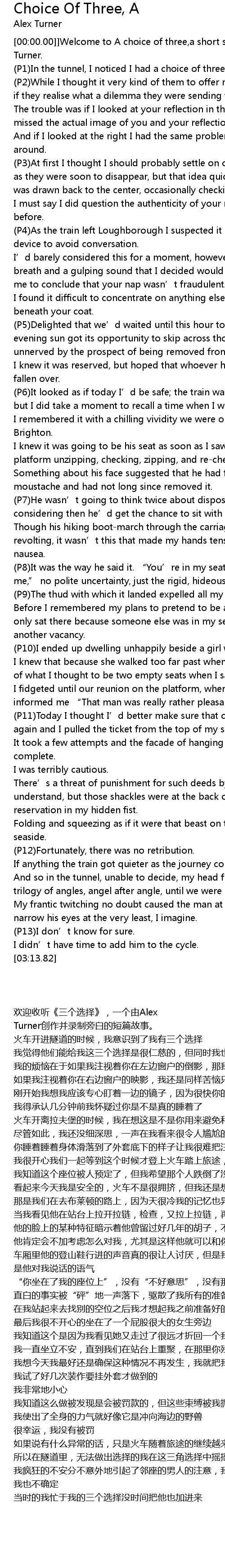 | [00:00.00]] | Welcome to A choice of three,a short story written and read by Alex Turner. |