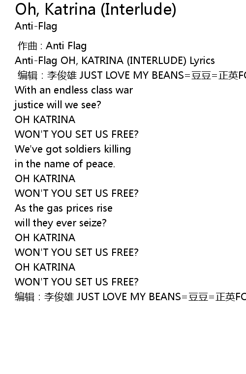 | [00:01.20] | Anti-Flag OH, KATRINA (INTERLUDE) Lyrics |