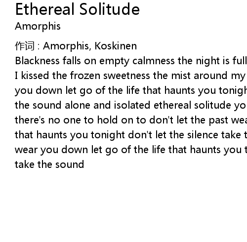 | I kissed the frozen sweetness the mist around my grief don' t let the past wear you down let go of the life that haunts you tonight don' t let the silence take the sound alone and isolated ethereal solitude you can keep all your secrets there' s no one to hold on to don' t let the past wear you down let go of the life that haunts you tonight don' t let the silence take the sound don' t let the past wear you down let go of the life that haunts you tonight don' t let the silence take the sound |