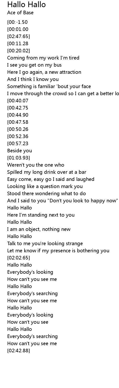 | [02:44.08][00:-1.50] | Ace Of Base Hallo Hallo |