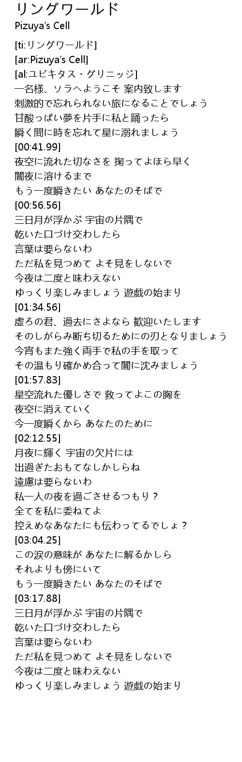 | [00:56.57] | 三日月が浮かぶ 宇宙の片隅で |